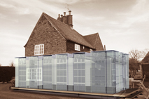 The conservatory is designed with classical elevations in a contemporary way, responding acutely to the scale of the existing property. Our aim was not to compete with the existing character of the house, instead proposing a design that was simple, light and transparent. The concept was based on an opening glass box that contains a series of screens, in a classical motif following that of an orangery, that slide in front of the glass. The screens allow for privacy and shade when closed and can be slid across, flooding the interior with light while providing access out into the garden.